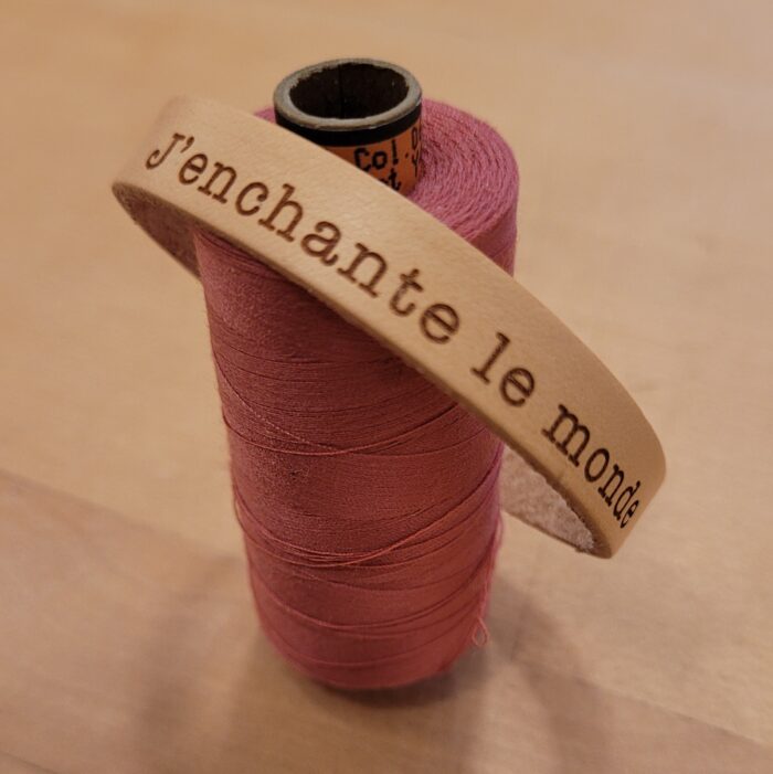 Le cuir de ce bracelet est français ou belge, et il est tanné dans la dernière tannerie wallonne. Les peaux sont ensuite découpées, directement dans la tannerie, et certaines sont enduites d’un apprêt blanc. D’autres sont laissées dans leur couleur naturelle. Agnès se rend ensuite dans un Fablab près de chez elle pour graver, patiemment, chaque bracelet. Pour que ses mots vous fassent du bien.