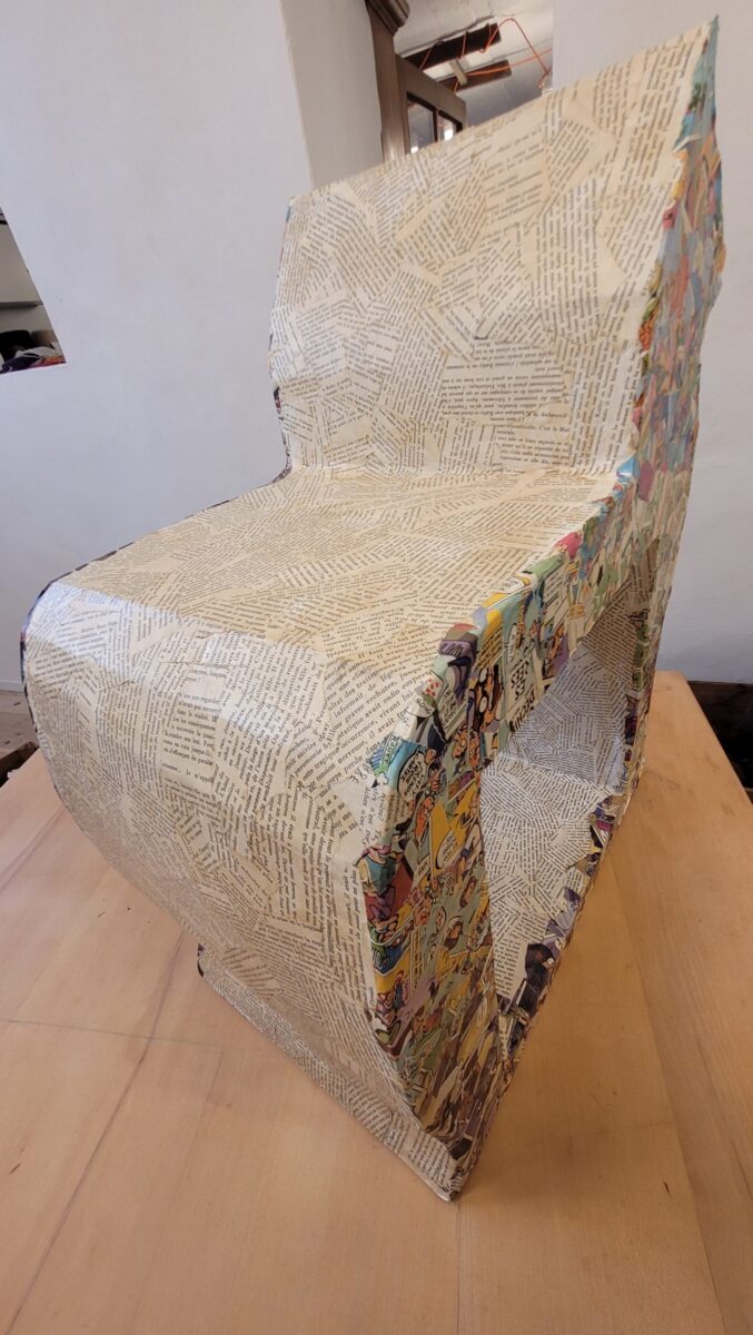 Etagère et tabouret ‘Chat » recouvert de feuilles de livres et BD. Pièce unique en carton recyclé très solide. Fabriqué à Bruxelles