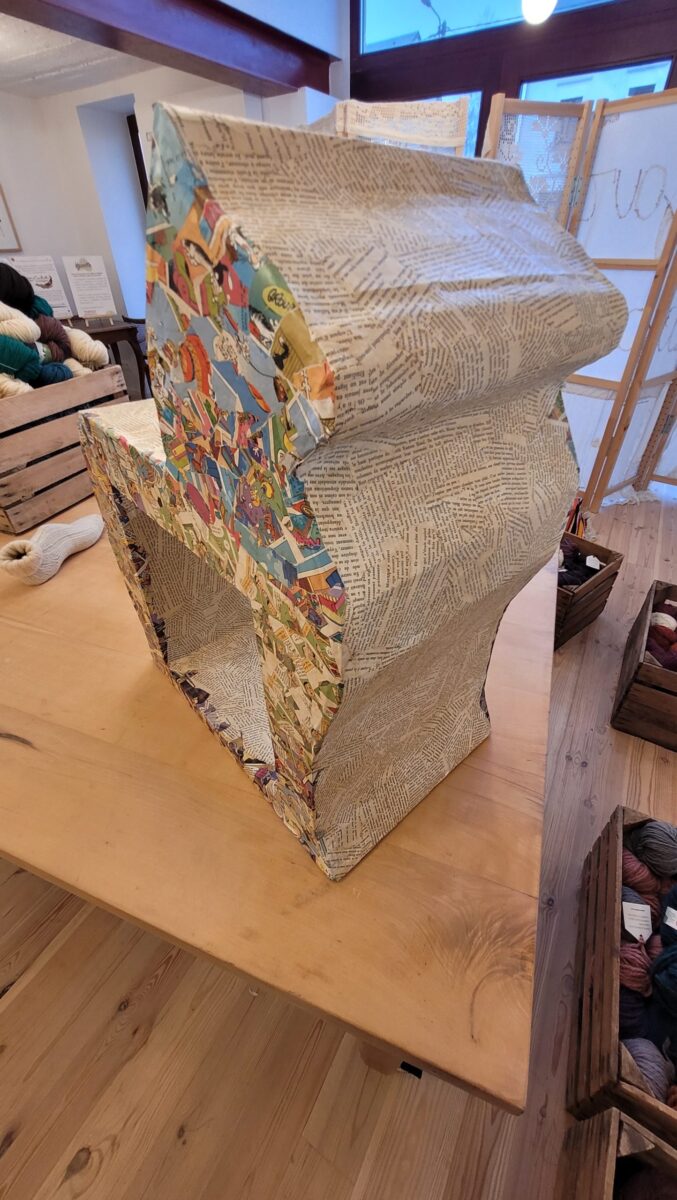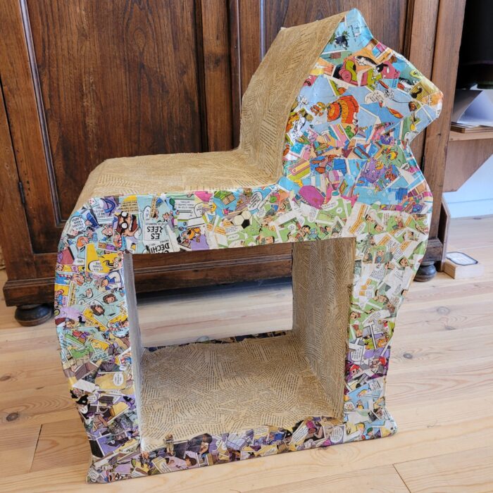 Meuble à double fonction réalisé entièrement à la main par une cartoniste bruxelloise. Elle récupère les grands cartons, hyper solides, des emballages de motos et vélos, les découpe et les assemblent selon son imagination et son talent. Ici, elle a recouvert le chat (à moins que ce ne soit un écureuil ?), patiemment, de morceaux de pages de BD et livres. Ce qui en fait un meuble tout à fait unique.