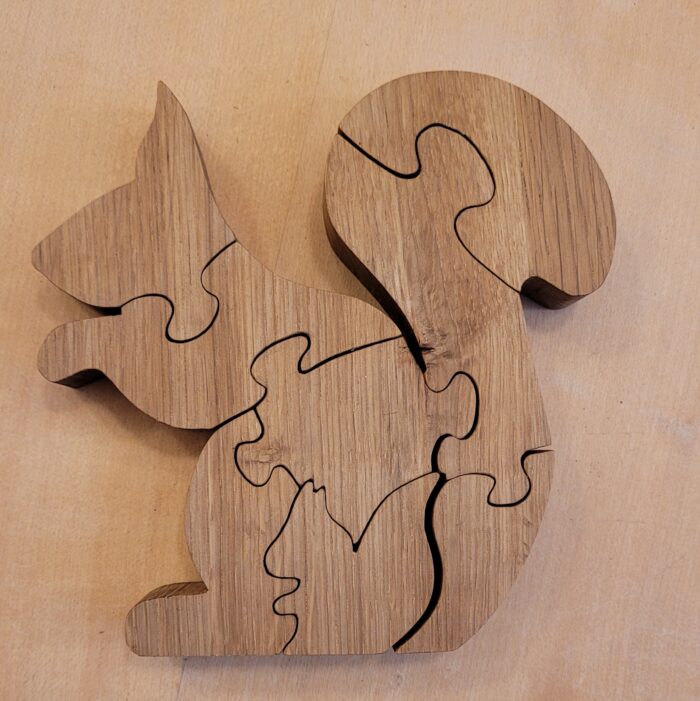 Puzzle en bois massif fabriqué artisanalement. Forme d’écureuil. Solide et durable.